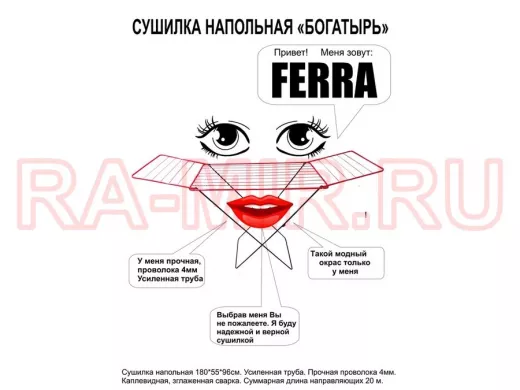 - "БОГАТЫРЬ" FERRA сушилка напольная КРАСНО-ЧЁРНАЯ 20 метров, предназначена для сушки белья