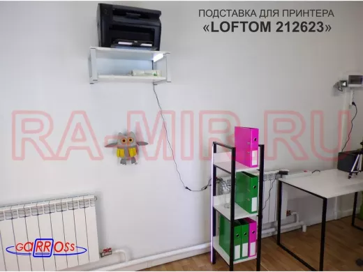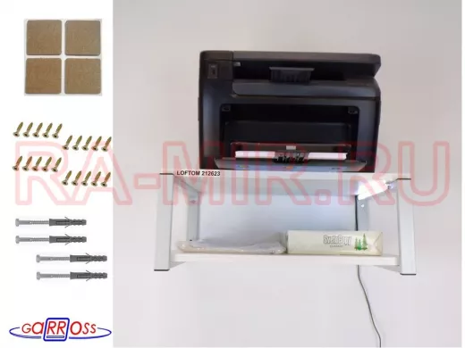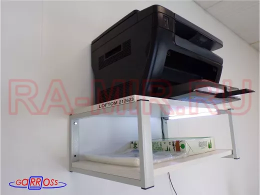 - Полка надежно крепится к стене при помощи анкеров или шурупов с дюбелями, на ней можно разместить принтер, сканер, МФУ и другую офисную технику