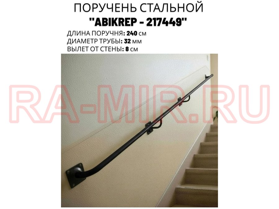Поручень пристенный для зданий, длина 240см вылет 8см "ABIKREP-217449" черный, 4 опоры, диаметр 32мм
