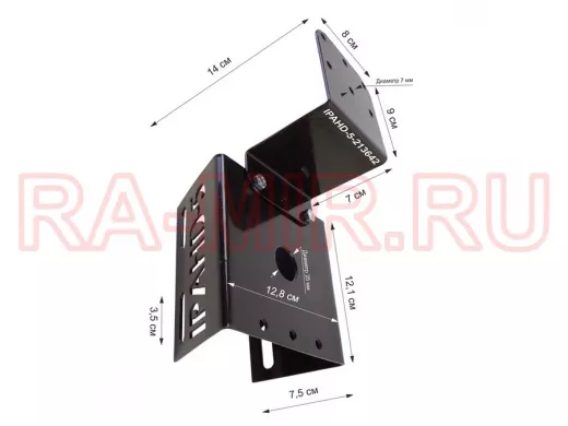 - С данным кронштейном нет необходимости в фиксации дополнительного крепежа под установку камеры и прожектора, все крепежные отверстия имеются на кронштейне. Три отверстия вверху диаметром 7мм и шагом 30мм и три внизу позволяют закрепить опции: водо-снего-солнце защитный козырёк (код товара: 90396) или светодиодный прожектор.