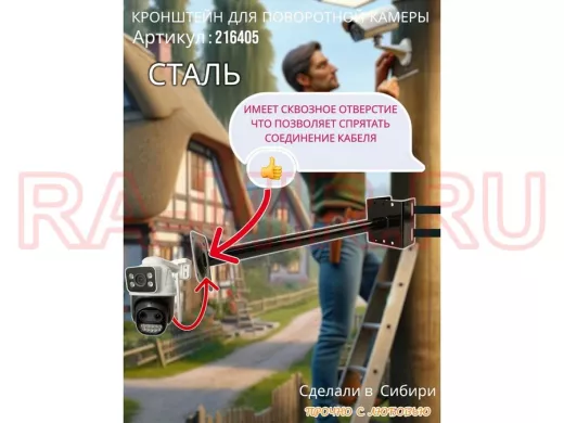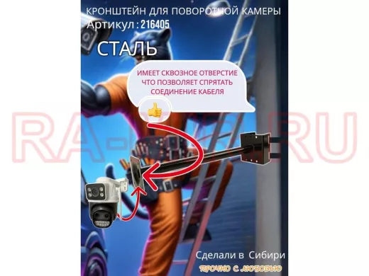 - Кронштейн для крепления видеокамеры на столб имеет сквозное отверстие, что позволяет спрятать соединения кабеля, тем самым защищает их от внешних воздействий (дождь, снег, ветер) поэтому нет необходимости использовать дополнительный гермобокс, т.к. разъемы спрячутся в трубе.