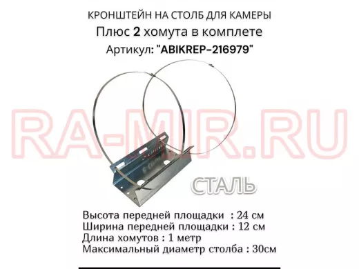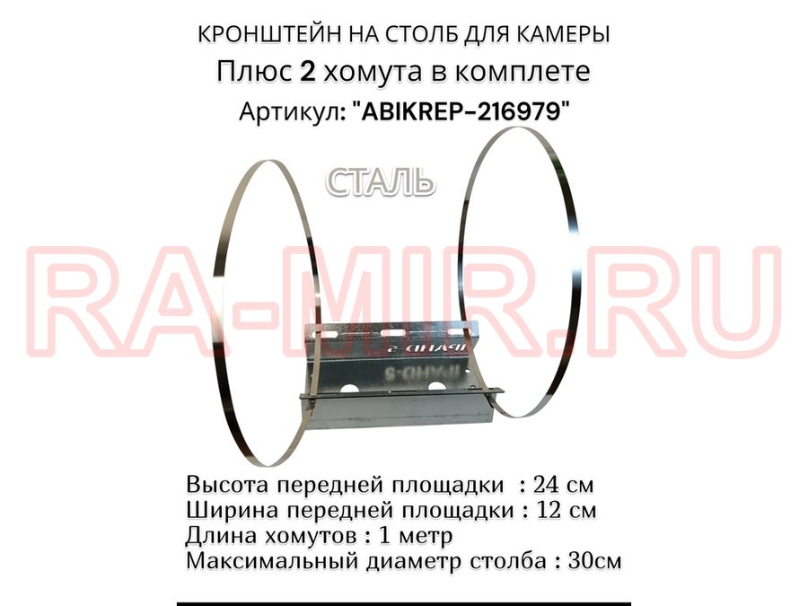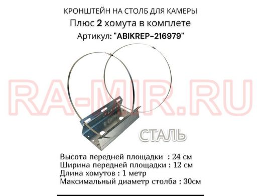 Кронштейн оцинкованный для камеры видеонаблюдения с хомутами на столб "ABIKREP-216979" 24х12см, 2отв
