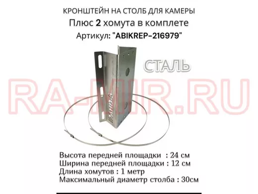 Заказать звонокКронштейн оцинкованный для камеры видеонаблюдения с хомутами на столб "ABIKREP-216979" 24х12см, 2отв