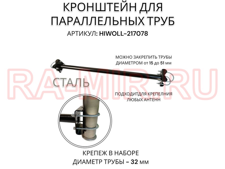 Кронштейн для параллельных труб диаметром от 15 до 51мм длина 75см "HIWOLL-217078" стальной, чёрный