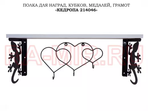 Заказать звонокПолка для наград, кубков, медалей, грамот "КЕДРОПА-214046 гекон"размер 15х60х24 см, сосна с сердцами