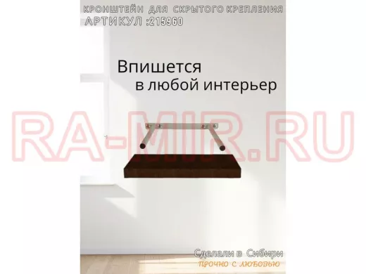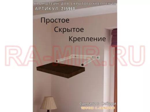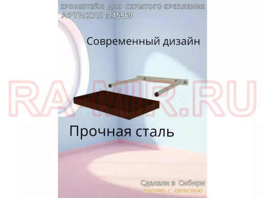 - Кронштейн предназначен для скрытого крепления полок, изготовленных из различных материалов: МДФ, ДСП, дерево, пластик.