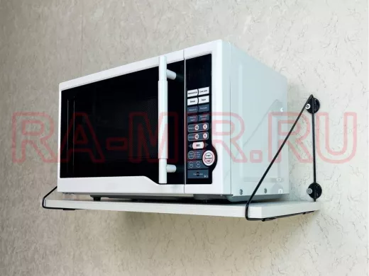 - Полка надежно крепится к стене при помощи анкеров или шурупов с дюбелями, на ней можно разместить микроволновую печь, кухонную технику, посуду, специи и многое другое