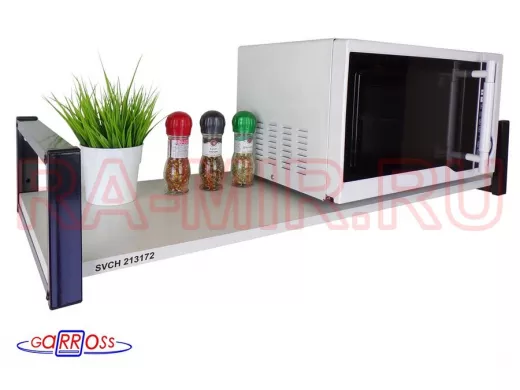 - Надежно крепится к стене при помощи шурупов с дюбелями, на ней можно разместить микроволновую печь, кофемашину, кухонную технику, посуду, специи