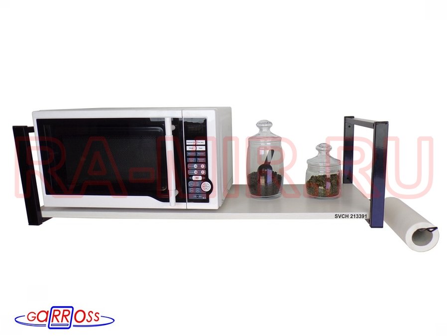- Полка надежно крепится к стене при помощи анкеров или шурупов с дюбелями, на ней можно разместить микроволновую печь, кухонную технику, посуду, специи