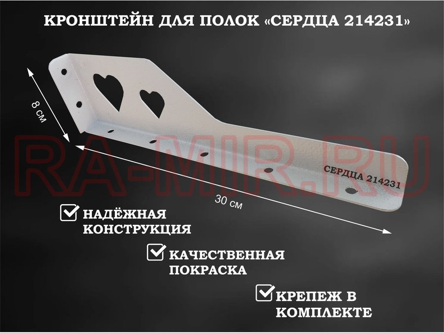 В корзину Купить в 1 клик Кронштейн "СЕРДЦА 214231" для полок, правый 30x8 см , 7 отверстий 7 мм, серый